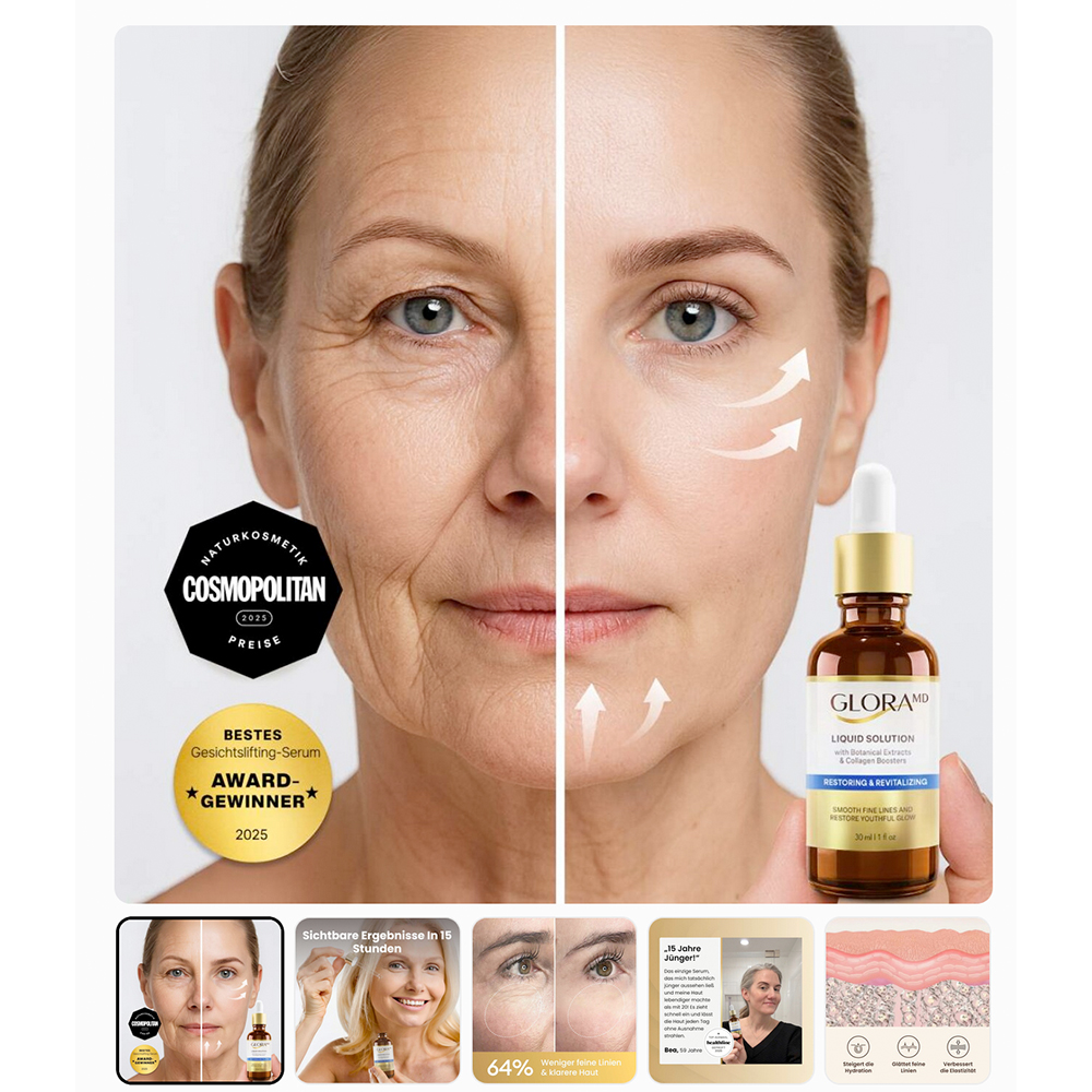 GloraMD Liquid Solution Anti Aging Serum ist die perfekte Lösung für alle, die sichtbare Zeichen der Hautalterung auf natürliche, sichere Weise bekämpfen möchten. Mit einer wissenschaftlich basierten Formel, tausenden begeisterten Kunden und bewährten, hochaktiven Wirkstoffen bietet GloraMD echte, messbare Ergebnisse. Vergessen Sie invasive und teure Verfahren – dieses Serum liefert Ergebnisse, die denen von professionellen Behandlungen ähneln. Investieren Sie in Ihre Haut und erleben Sie die Transformation zu strahlender, prallerer, jugendlicher Haut in nur wenigen Wochen. GloraMD ist nicht nur ein Serum – es ist eine Investition in Ihre Schönheit und Selbstvertrauen!